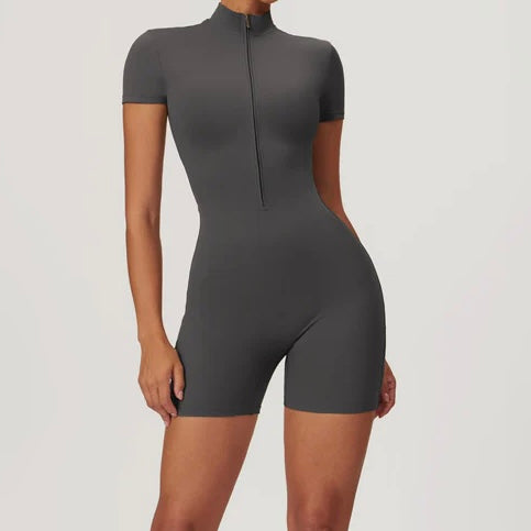 - Este mono deportivo de una pieza combina estilo y funcionalidad. Con cuello alto y media cremallera frontal, su diseño ajustado ofrece un look elegante y a la vez cómodo para tus entrenamientos o uso diario.